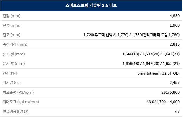 싼타페 가솔린 2.5 터보의 경우 최대 281마력에 43 토크의 파워를 지녔습니다.