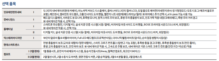 인포테인먼트내비 I과 현대스마트센스는 안전한 주행과 주차를 위해 필수 옵션으로 보입니다.