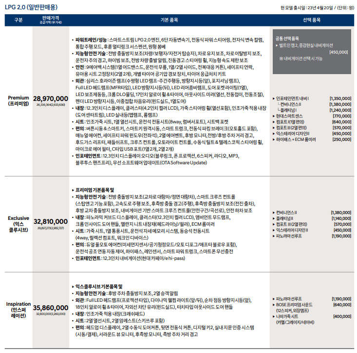 | 등급 | 가솔린 2.0 | LPG 2.0 | 하이브리드 |
