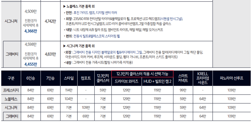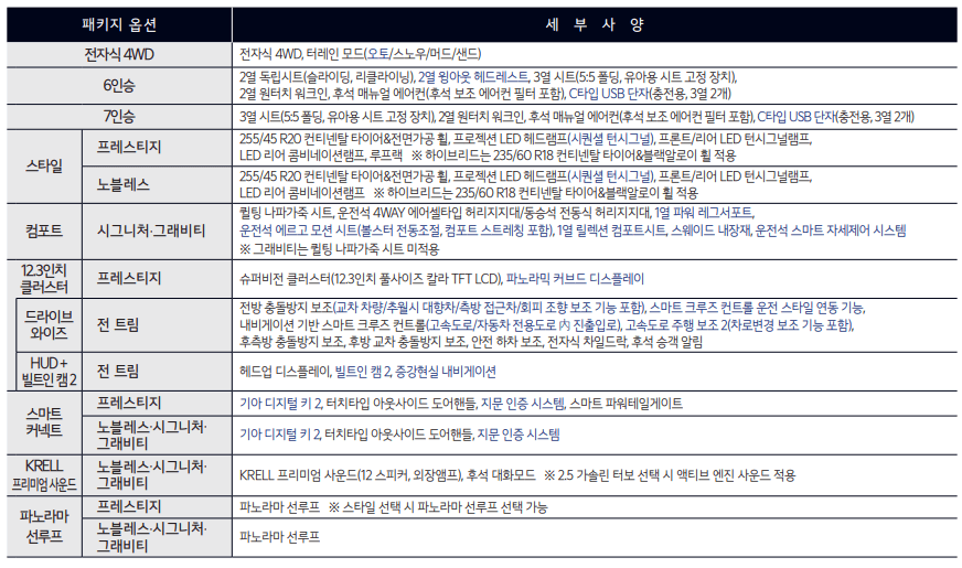 | 등급 | 가솔린 2.5 | 디젤 2.2 | 하이브리드 |