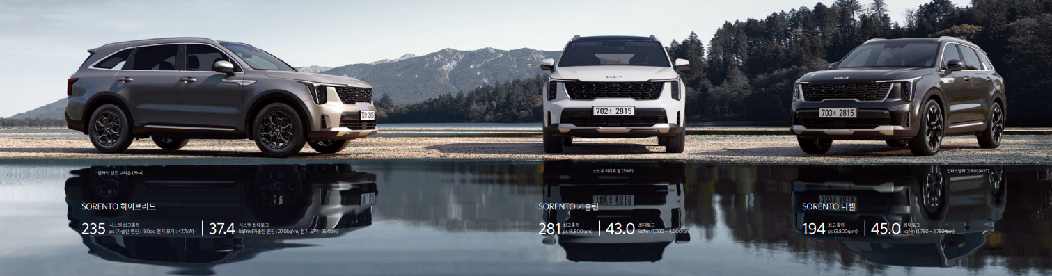 쏘렌토 가솔린의 경우 최대 281마력에 43 토크, 디젤은 최대 194마력, 45 토크, 하이브리드는 최대 235마력, 37.4 토크의 파워를 지녔습니다.